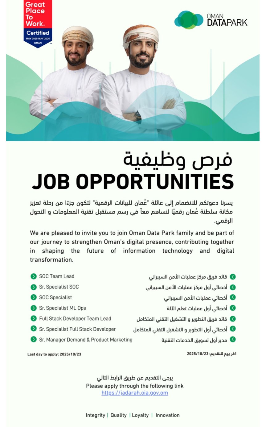 أعلنت شركة عمان داتا بارك، عن فتح باب التقديم لشغل الوظائف التالية: