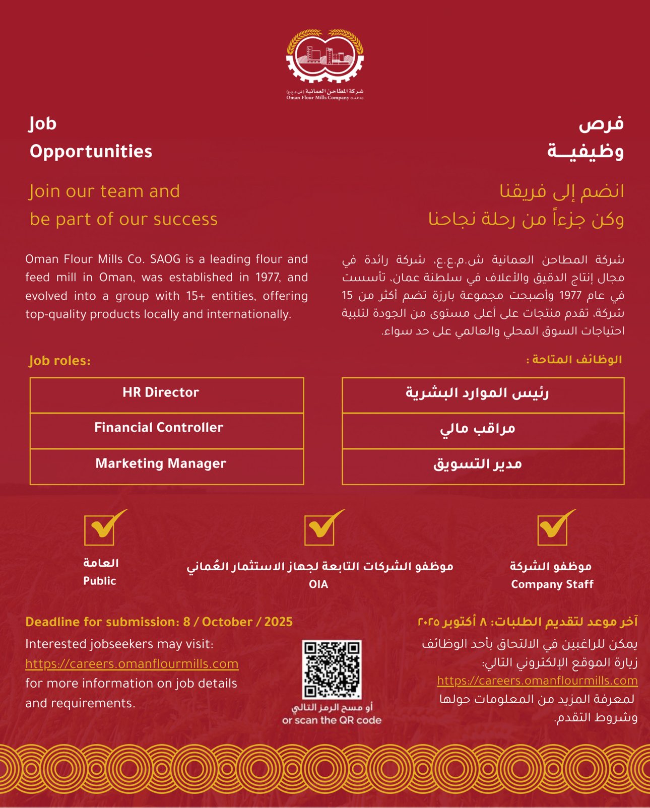أعلنت شركة المطاحن العمانية في مسقط، عن فتح باب التقديم لشغل الوظائف التالية:
